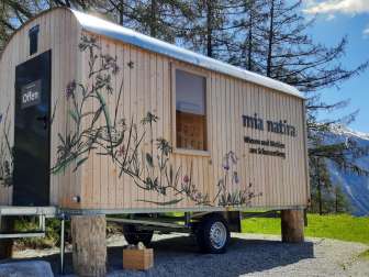 Die kleine Ausstellung mia natira im ausgebauten Bauwagen gibt Einblick in die Kulturlandschaft und Artenvielfalt am oberen Schamserberg.