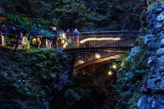 Erwin Dirnberger lässt viele Figuren im offenen Bühnenraum des Besucherzentrums wieder aufleben und geleitet das Publikum anschliessend mit Originalzitaten und Liedern hinunter in die nächtliche Schlucht.