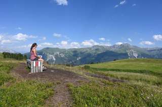 Sitzbank beim Bergsee Libi mit Aussicht über das Schams.