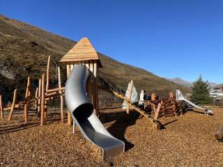 Die Feuerstelle liegt direkt beim Spielplatz, welcher sehr liebevoll nach dem Thema "Murmeltier" gestaltet wurde.