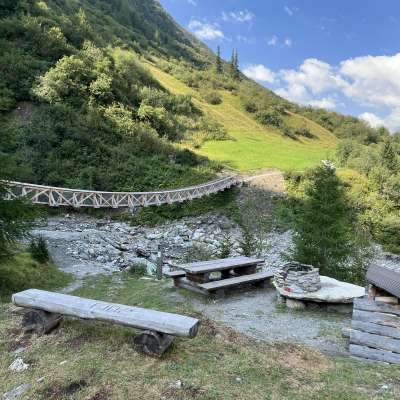 Die Feuerstelle der Schweizer Familie liegt direkt beim Zusammenfluss von Kapellbach und Hinterrhein. Der Kapellbach stürzt in einem imposanten Wasserfall in die Tiefe, bevor er sich in den Hinterrhein schlängelt. Von der Hängebrücke (Baujahr 2021) hat man einen guten Blick auf den Wasserfall.
