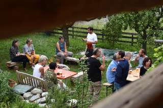 Umgeben von altem Gemäuer und ebenso altem Balkenwerk, versehen mit einem transparenten Windschutz, ist eine behagliche Atmosphäre entstanden. Der grosse Tisch im Zentrum lädt genauso zum Verweilen ein wie die lauschige Sitzecke mit Sofa und Fauteuils. Doch bevor man hier zum Absitzen kommt, erspäht das Auge allerlei, das unbedingt von Nahem betrachtet werden will. Sei es das alte Radiogerät, seien es die speziellen Lichtquellen oder die auf einem alten Holzherd präsentierten und einen weiteren Hauch Italianità verbreitenden Produkte zum Verzehr.