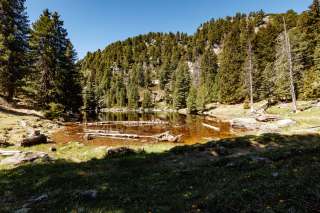 Der dunkle Seeboden und die umliegenden Tannen lassen das Wasser fast schwarz erscheinen. Im Hochsommer kann es sein, dass der See ganz ausgetrocknet ist.
