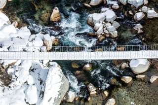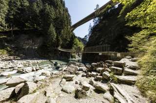 Schmal und schnörkellos führt diese Brücke als Teil des Wanderwegnetzes - für einmal nicht über den Abgrund der Viamala, sondern direkt über den Rhein, der hier in einer bläulich schimmernden Bucht ausruht, bevor er weiter durch die Schlucht stürzt.