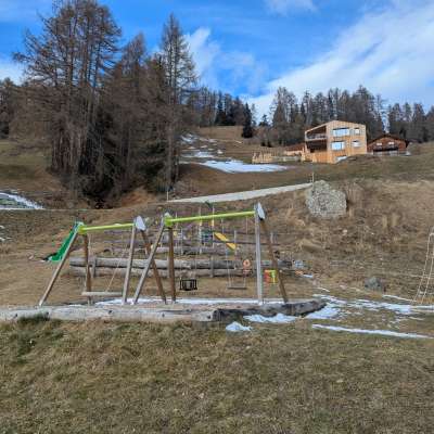 Der Spielplatz befindet sich direkt beim grossen Parkplatz in Mathon, neben dem Feuerwehrdepot.