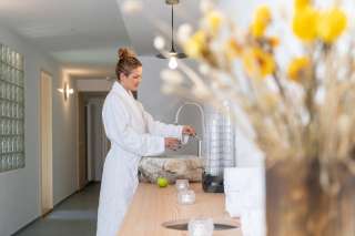 Entspannen Sie sich nach sportlichen Aktivitäten im Dampfbad mit lokalem Andeerer Granit, in der Sauna und im Ruheraum mit herrlichem Berg-Panorama ins Val Schons und geniessen Sie die Stille für Ihr «bainesser».