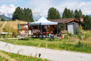 Euer Camper Treff mit Sonnenterrasse ist täglich geöffnet und lädt bei Frühstückskaffee oder Apéro zum gemütlichen Verweilen bei interessanten Gesprächen mit Gleichgesinnten ein (weitere Informationen).