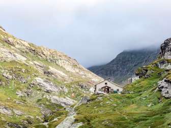 Traditionelle Hütte in der Nähe des Zapport- und Paradiesgleschers, am Ursprung des Hinterrheins. Die Zapporthütte, 1872 am Gletscherrand erbaut, liegt auf 2'276 m ü.M.