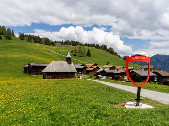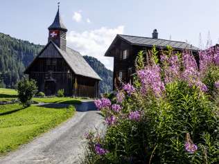 Die Kirche von Obermutten zählt zu den einmaligen Sakralbauten der Schweiz. Sie ist das einzige Gotteshaus, das ganz aus Holz gefertigt wurde. Die umliegenden Lärchenwälder boten dazu das geeignete Material.